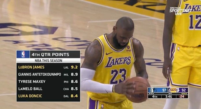 据统计,本赛季至今,詹姆斯末节场均可以得到9.2分为联盟最多(本场赛前数据)。
