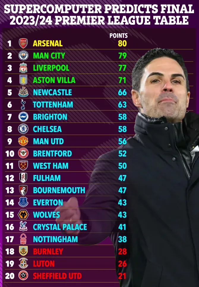 近日,英国《太阳报》通过超级计算机进行了超过10万次模拟,综合本赛季英超球队战绩,赛程等众多因素,对英超联赛最终积分榜进行推算。