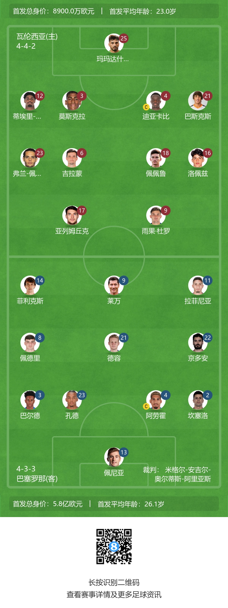 瓦伦西亚替补:1-多梅内克、13-里韦罗、15-奥兹卡查、20-富尔基耶、19-阿马拉、7-卡诺斯、22-阿尔贝托-马里、34-亚雷克、27-戈萨贝斯、30-H-冈萨雷斯