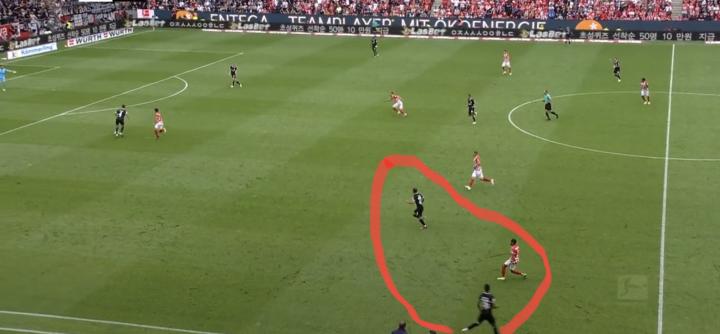 但这个球来得空穴来风么?当然没有。斯塔赫本质是中场,不会搞压迫,格鲁达的压迫帮倒忙,里希特上来发现自己在弱侧,就这进攻线,对手不想反推都能反推了。认真的说,里希特踢边翼卫,哪怕克劳斯踢边翼卫,都不至于这样。