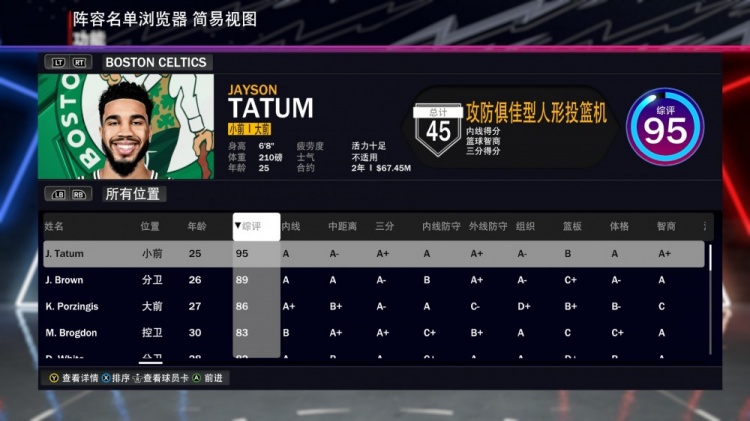 7人80+!绿军全队2K24能力值:塔图姆95 杰伦89 波津86