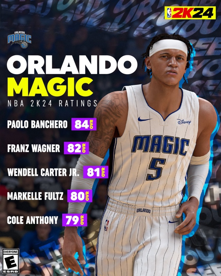 9月8日讯 今天,魔术官方社媒公布了队内部分球员在2K24中的能力值。