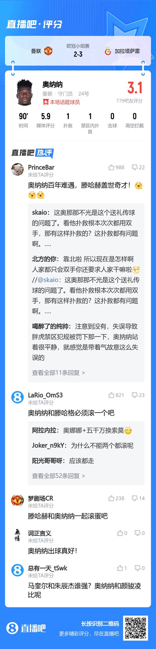 欧冠A组第2轮,曼联主场2-3不敌加拉塔萨雷,两连败垫底。奥纳纳本场表现糟糕,来看吧友在【战报评分栏】的锐评吧!